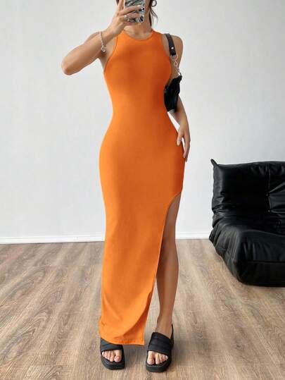 SHEIN EZwear 女士時尚純色高開叉無背洋裝 - 橘色 - 查看 1