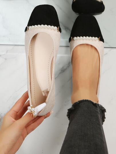 女士人造珍珠裝飾方頭時尚仿麂皮芭蕾舞鞋適用於戶外 - 米色 - 查看 1