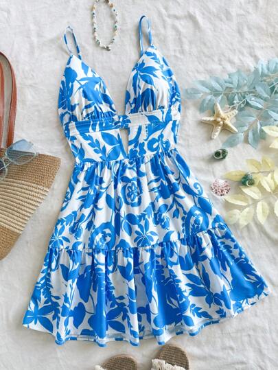 Soleia 女士节日花卉印花细肩带露背 A 字型迷你连衣裙 - 淺藍色 - 查看 1