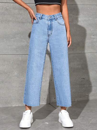 SHEIN EZwear 高腰九分直筒牛仔褲 - 淺色水洗藍 - 查看 1