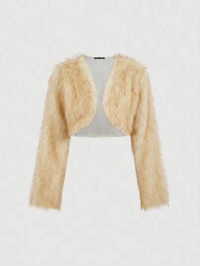 SHEIN MOD 女士卡其色短款人造毛皮夹克、毛皮大衣、冬季女士大衣、女士服装 - 卡其色 - 查看 1