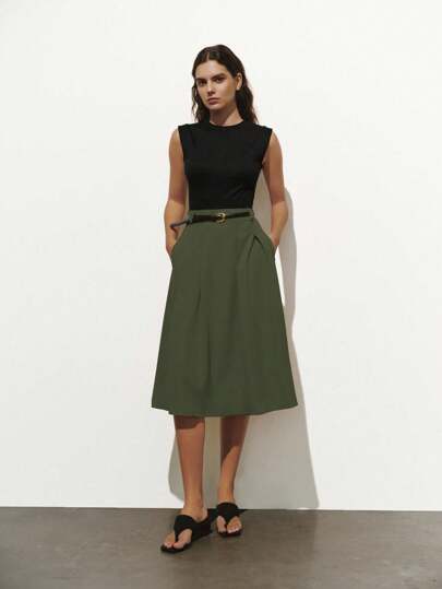 Lumivelle 女士针织褶裥口袋圆领中长连衣裙 夏季大学服装 - 軍綠色 - 查看 6