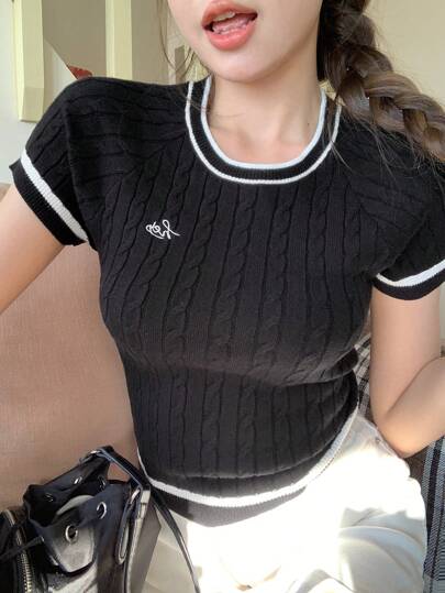 DAZY 女式字母图案圆领短袖撞色针织上衣 - 黑色 - 查看 1