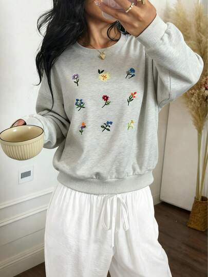 女士长袖套头衫,精致花卉刺绣针织面料,常规长度上衣 - 淺灰色 - 查看 1