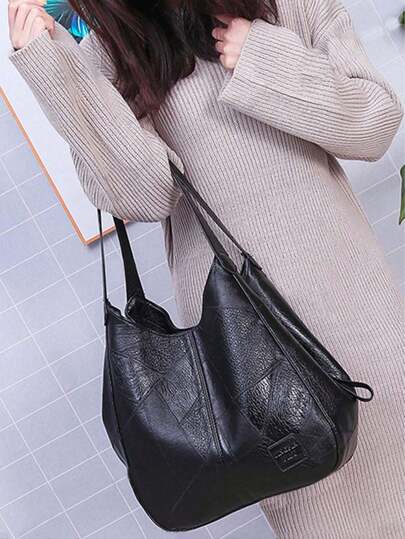 女士中号单肩包,缝线细节,PU材质手提包