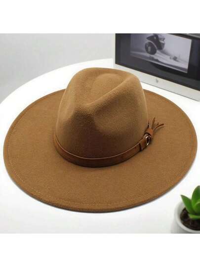 Women Men Wide Brim Fedora Hat Solid Color Belted Wool Hat Felt Jazz Cap For Party