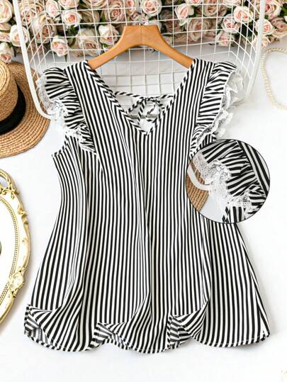 SHEIN LUNE 女士加大码 V 领条纹蕾丝袖休闲衬衫 - 黑與白 - 查看 1