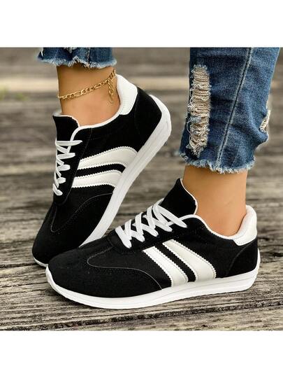 Women'S Lightweight Fashion Sneakers- Comfortable, Non-Slip, Lace-Up Casual Sneakers With Cushioned Insoles, White And Blue Striped Design, Low-Cut EVA Sole, Suitable For All-Day Wear, Casual Sneakers| Low-Top Sneakers| Lace-Up Closure