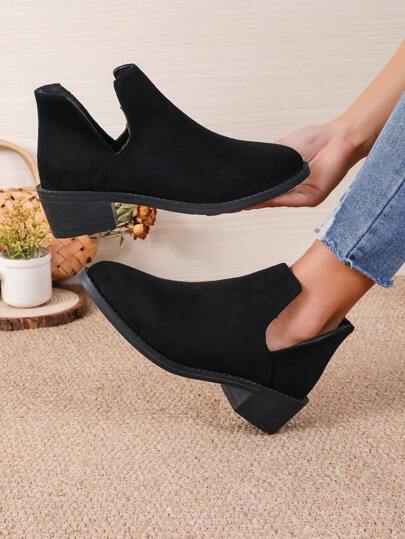 女式純色粗跟尖頭休閒英倫風舒適踝靴和短靴,黑色 - 黑色 - 查看 1