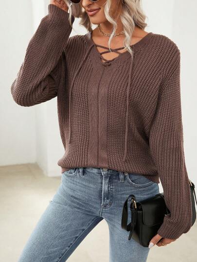 EMERY ROSE 女士系帶前扣式梳肩長袖毛衣 - 棕色 - 查看 1