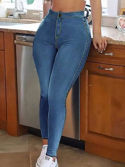 女士简约日常窄脚紧身裤 - 淺色水洗藍 - 查看 1