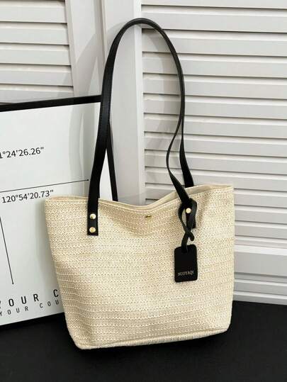 女士简约编织拼色单肩托特包,度假元素沙滩水桶包 - 黑色 - 查看 1
