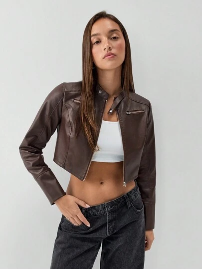 SHEIN x Carly Lawrence SHEIN Unity 女士纯色前拉链简约 PU 修身短款夹克 - 棕色 - 查看 1