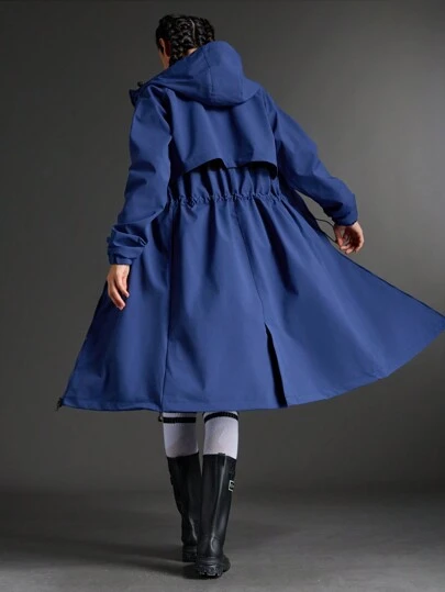 SHEIN Sports 女士纯色长袖抽绳腰长款休闲连帽运动夹克 - 藏蓝色 - 查看 1