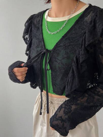 FRIFUL 女士纯色透明扭纹前长袖上衣 - 黑色 - 查看 9