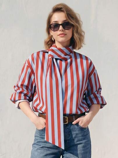 女士春夏优雅休闲蝴蝶结领撞色条纹衬衫
