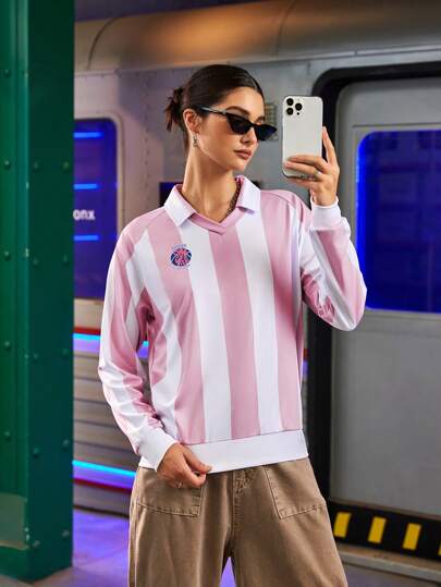 SHEIN Sports 女性條紋印花休閒日常長袖polo衫,適用於運動 - 淡紫色 - 查看 6
