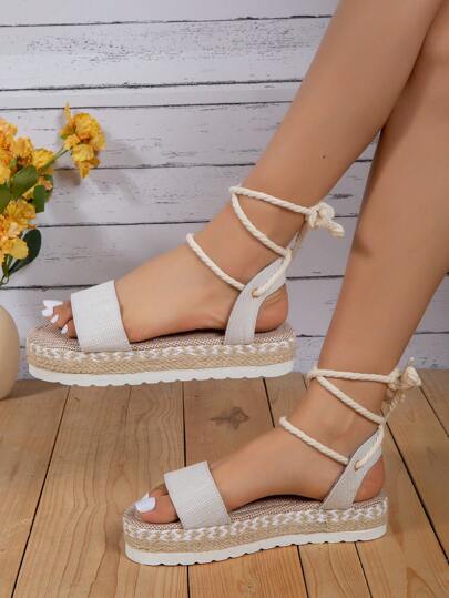 女士腿部繫帶設計編織度假亚麻條帶厚底涼鞋適合夏天 - 灰色 - 查看 5