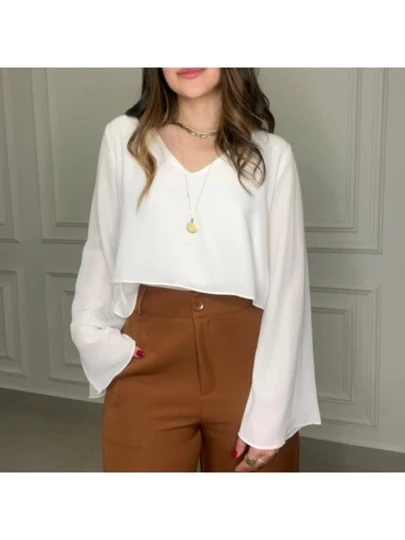 Review: Blusa no tecido duna, porém não parece feio. Gostei bastante, ótima pra trabalhar. Ah, com calça de cintura alta fica ideal, pois o comprimento da blusa é até o umbigo.