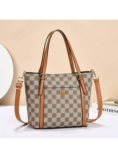 Women Tote Bags - 棋盤格-卡其拼黃 - 查看 1