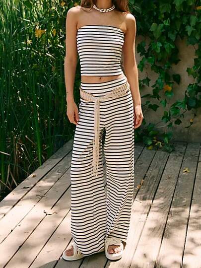 Women's 2 Piece Summer Stripe Casual Outfits Back Pleated Striped Print Bandeau Tops And Elastic Waist Wide Leg Long Pants Set Streetwear
