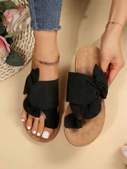 女士黑色蝴蝶装饰人字拖平底凉鞋,绒面革趾环设计,渔夫风格沙滩鞋,夏季新款休闲平底人字拖 - 黑色 - 查看 1