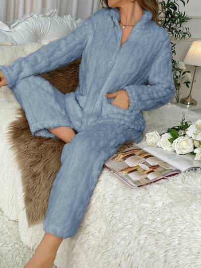 女士藍色連帽長袖長褲家居服套裝 - 藍色 - 查看 1