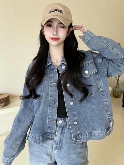 女士休闲宽松牛仔夹克,有领,长袖,适合秋冬季 - 藍色 - 查看 1