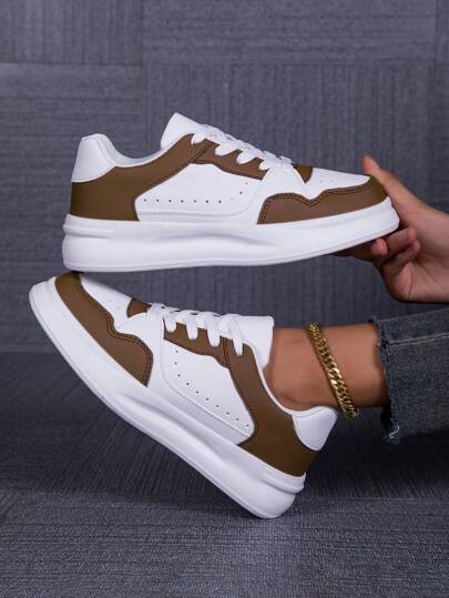 女士休闲简约软底系带圆头厚底轻便舒适运动鞋 - 咖啡棕 - 查看 1