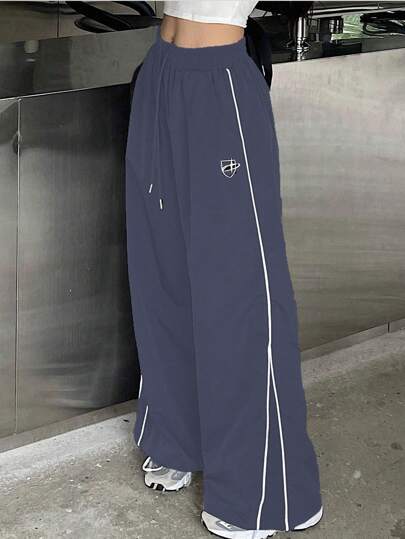 DAZY SHEIN X AYA NAKAMACHI 女款拼色弹力腰卷边阔腿裤 - 霧霾藍 - 查看 1