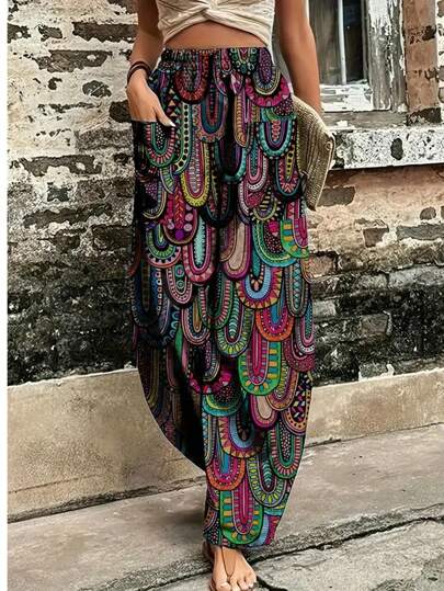 女士彩色波西米亚风梭织面料哈伦裤,长款无弹力灯笼裤 - 彩色 - 查看 1