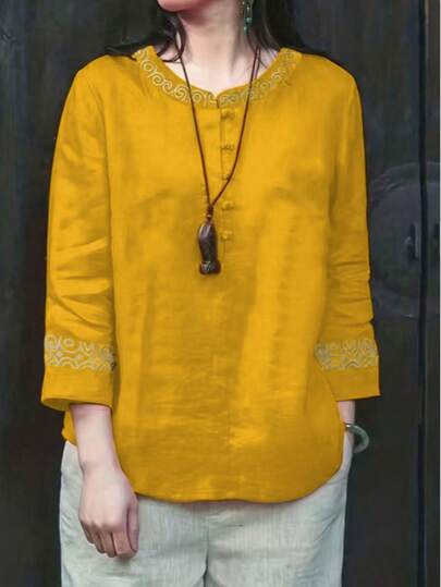 女士圆领拼色休闲度假衬衫 - 黃 - 查看 1