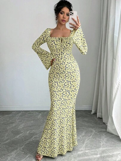 女士碎花印花 U 领方领法式优雅长款紧身鱼尾裙
