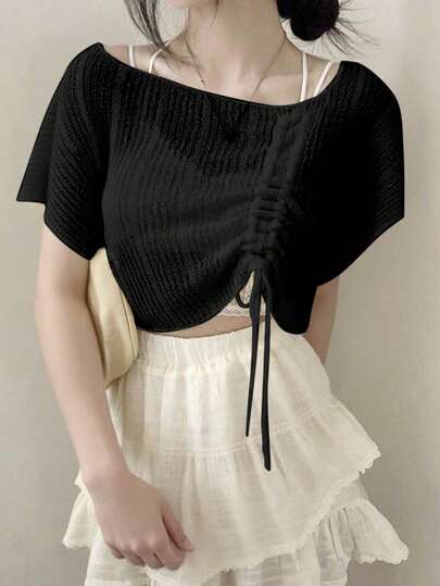 2025年夏季女士优雅抽绳针织上衣,设计元素丰富 - 黑色 - 查看 1