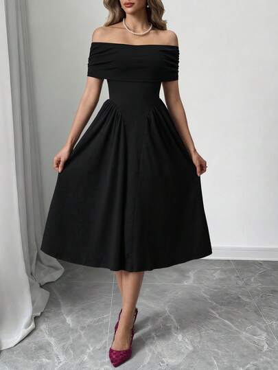 女士优雅荷叶边露肩正式晚会婚纱,夏季纯色连衣裙 - 黑色 - 查看 1