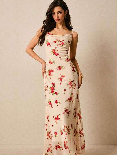 女士优雅满花印花超长吊带裙