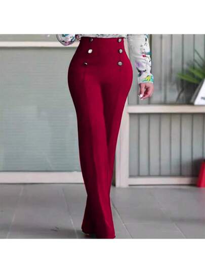 欧美风女式时尚纽扣装饰休闲街头风百搭裤 - 酒紅色 - 查看 1