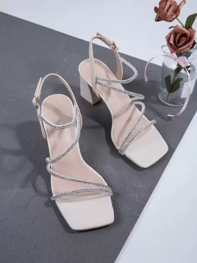 女士时尚高跟凉鞋,水晶绑带,适合日常和派对穿着,春夏百搭单品 - 米色 - 查看 1