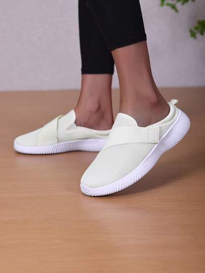 女士时尚针织透气舒适运动鞋,防滑耐磨一脚蹬纯色休闲运动鞋,男女皆宜,适合户外休闲运动 - 米色 - 查看 1