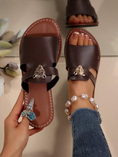 女士时尚豹纹头金属装饰凉鞋,镂空绑带设计,咖啡色沙滩鞋,圆头优雅度假风格平底拖鞋,适合夏季 - 咖啡棕 - 查看 1