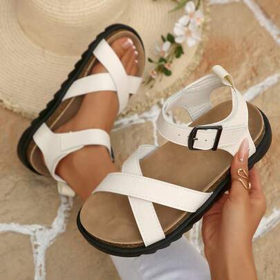 女士时尚厚底坡跟平底搭扣镂空交叉运动凉鞋 - 白色 - 查看 1