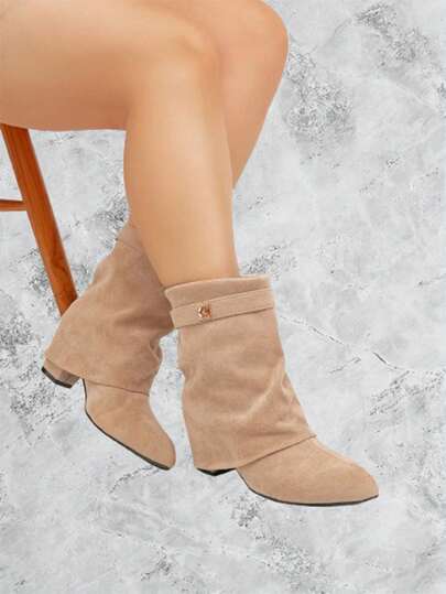 女士时尚宽楦仿皮高筒靴,假日度假氛围,折叠靴筒,粗跟,黑色性感户外高跟踝靴,宽腿高跟靴,女士宽筒靴 - 杏色 短布 - 查看 1