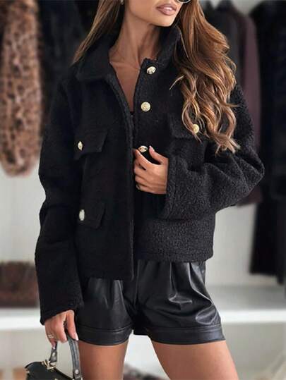 女士时尚翻领短款羊毛开衫外套,修身廓形,长袖,冬季 - 黑色 - 查看 1