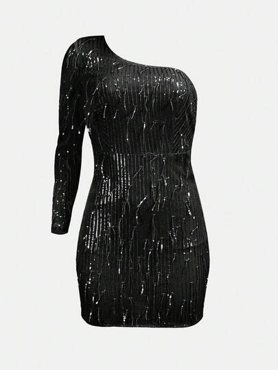 單肩亮片緊身連衣裙 - 黑色 - 查看 1