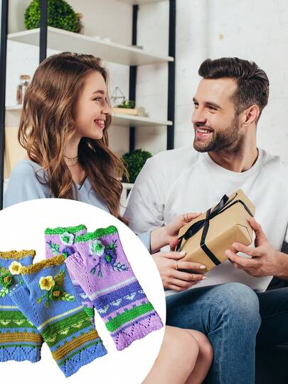 女士手工勾花小花保暖针织绣花手套提花手工纱手套 - 彩色 - 查看 1