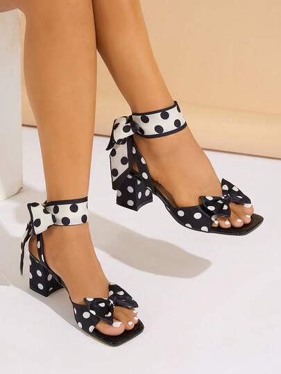 女士高跟凉鞋,适合派对、户外、旅行、时尚度假,粗跟,方头,波尔卡圆点围巾系带,蝴蝶结,闪亮的石头纹理,纯色,高端优雅的黑色高跟凉鞋 - 黑色 - 查看 1