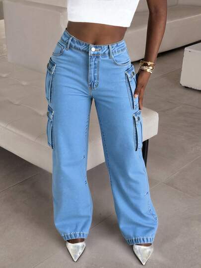 女士高腰工装口袋直筒牛仔裤 - 经典水洗舒适休闲牛仔裤