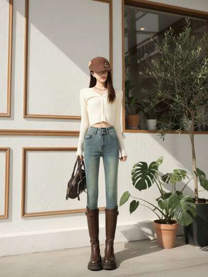 女式高腰口袋紧身休闲百搭牛仔裤,秋季 - 淺色水洗藍 - 查看 1