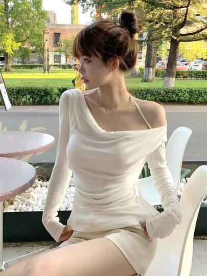 女士长袖T恤,白色,针织面料,露肩套头衫,春夏新品 - 白色 - 查看 1