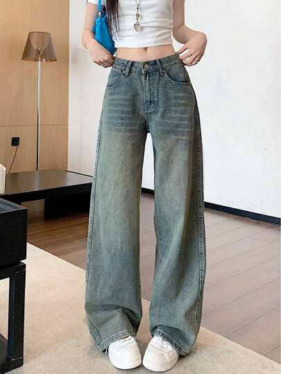 女式宽松口袋阔腿休闲牛仔裤 - 藍色 - 查看 1